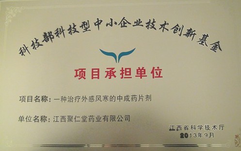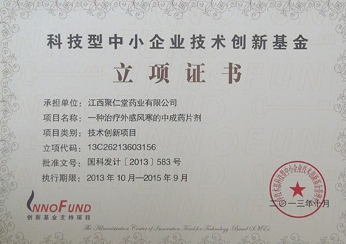 近日,由江西聚仁堂藥業有限公司生產的傷風停片獲得科學技術部大力支持,成為科技部科技型中小企業技術創新基金項目,并被授予70萬元創新基金。與此同時,江西省科學技術廳向聚仁堂藥業頒發了“科技部科技型中小企業技術創新基金項目承擔單位”牌匾。