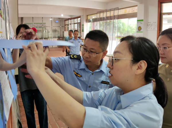 2023年9月14日上午,南昌縣縣委常委統(tǒng)戰(zhàn)部皮部長、八月湖街道辦市場監(jiān)管局李局長等領(lǐng)導(dǎo)一行冒著蒙蒙細(xì)雨深入我校進(jìn)行安全檢查,全面檢查了學(xué)校食堂開學(xué)后的師生伙食服務(wù)情況及食品衛(wèi)生安全工作。