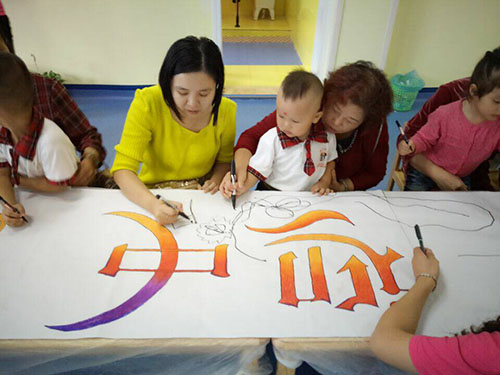 小朋友和老師家長們共同在畫紙上揮動手中的畫筆。看,小朋友們個個認真、專心畫畫的模樣,多可愛啊!