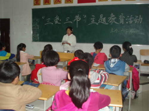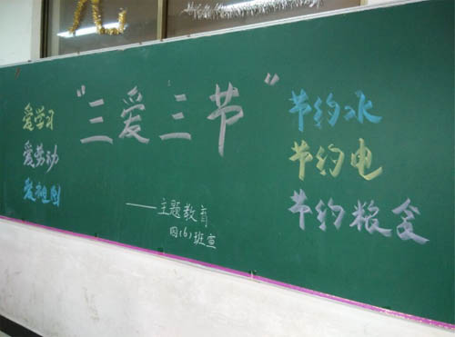 各班以班級為單位都開展了“三愛 三節”主題班會活動?;顒有问蕉鄻樱械囊灾R競答方式普及生活中的三愛三節知識,有的用多媒體播放愛學習、愛勞動、愛祖國的典型事例;有的以演講形式聯系身邊節水、節電、節糧的故事進行講解,闡述自己的收獲;有的制作手抄報反映自己對“三愛三節”的理解。