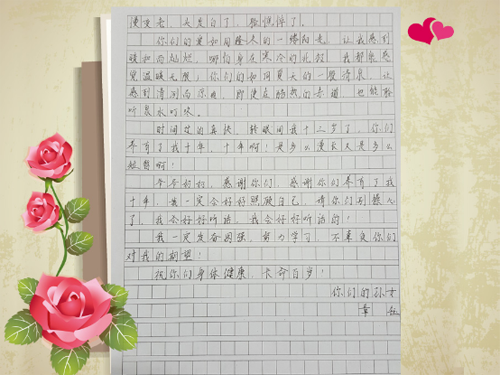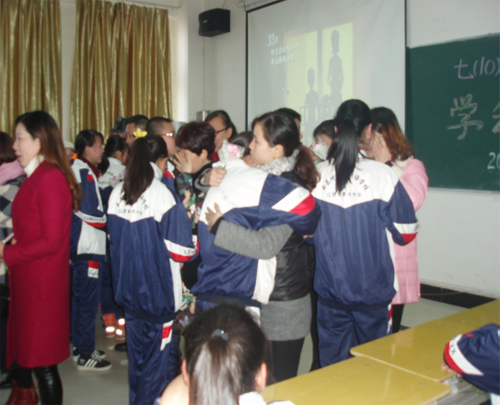 在感恩父母的環節中,主持人展示一系列關于自己父母的問題向同學們提問,考查同學們對自己父母的了解程度。緊接著播放視頻《人的一生,感恩教育》 ,短片中浮現出我們從小到長大成人及父母從年輕到年邁各階段的特征,旨在培養學生的感恩之心。視頻過后,展示的是一名叫章鈺同學寫給爺爺奶奶的一封信。章鈺三歲時,父母就分開了,爺爺奶奶撫養了章鈺整整十年。在這十年間,爺爺奶奶承擔了太多本該章鈺父母承擔的責任。寒冬里,他們起早床,為孫女準備早餐,洗衣服。晚上,悉心為孫女蓋被子。十年間,章鈺在慢慢長大,爺爺奶奶卻在慢慢變老。借此機會,章鈺同學利用攢下的零花錢,為爺爺奶奶獻上了一份真摯的禮物,感謝他們的養育之恩。此時,《時間都去哪了》從耳邊傳來,三人相擁而泣。情到深處,感人肺腑,全場為之動容,在座的校長、老師、家長、同學們都流下感動的淚水。借著章鈺同學對爺爺奶奶的深情傾訴,主題班會來到了此環節的最后一部分,部分同學給父母獻禮,同學們紛紛感激父母的養育之恩,對自己的不懂事表示深深的愧疚。