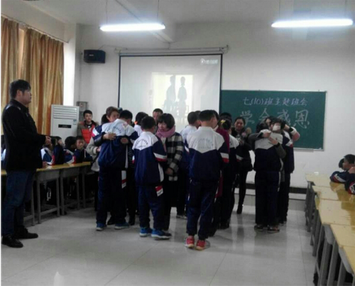 隨著獻花過程的結束,班會來到了第三個環節:感恩青春季。此環節中,涂章宇同學講了關于羅斯福感謝小偷的故事,告訴同學們要常懷感恩之心。接著,全體同學用手語演唱《感恩的心》,以表達對長輩、父母、老師、朋友、身邊每一個幫助過自己的人的感恩之情。表演過后,吳加亮老師做出總結,感謝校領導、年級組老師、家長的幫助與支持,希望同學們學會感恩,做一個心中有愛的人。最后,陳勇鋒校長總結講話,給予了此次班會很高的評價,祝愿七(十)班有一個美好的明天。
