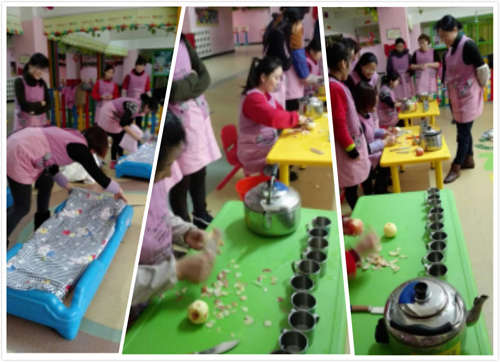 此次比賽由劉老師,史老師擔(dān)任評委。比賽內(nèi)由削蘋果,倒水,疊被子等幾部分組成,在比賽中保育老師結(jié)合實際情況來完成比賽,在比賽中互相切磋、討論,在實踐中互相觀摩、討論技巧;還加深了對保育工作標(biāo)準(zhǔn)化、流程化、規(guī)范化服務(wù)的認(rèn)識,通過本次比賽不但提高了老師的保育技能,也為每一位保育員提供了自我展示的舞臺。在以后的日子里,我園將一如既往的秉承保教一體的理念,不斷提高幼兒園保育工的質(zhì)量。