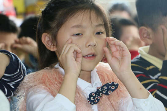 在老師帶領下,小朋友正在做眼保健操