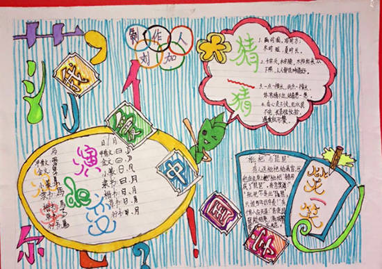語文教材第五組《綜合性學習:遨游漢字王國》是引導學生進行綜合性學習,初步了解漢字的特點和發展歷史,加深學生對漢字和中華傳統文化的感情,提高正確運用漢字的自覺性。同時培養學生策劃和開展活動、查找和運用資料的能力。比賽前語文老師組織學生學習了有關課文,讓學生收集“有趣的漢字”各方面的知識,并通過自己靈巧的雙手,精心設計版面,創作出了一幅幅色彩艷麗、構思獨特、內容豐富的手抄報。本次手抄報內容涉及有趣的字謎、倉頡造字、一點值千金、諧音歇后語、諧音笑話、字的來歷等方面的知識,收到了很好的教育效果。