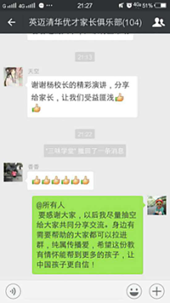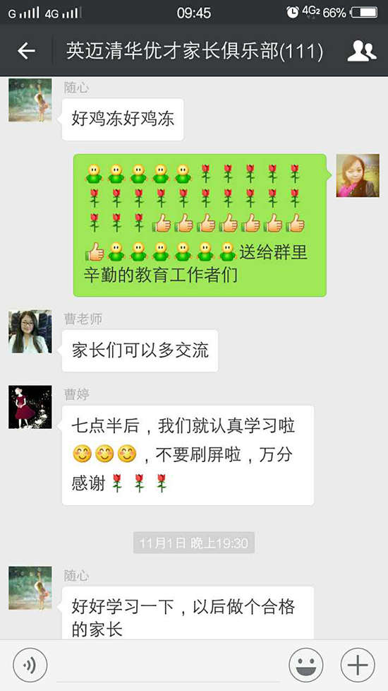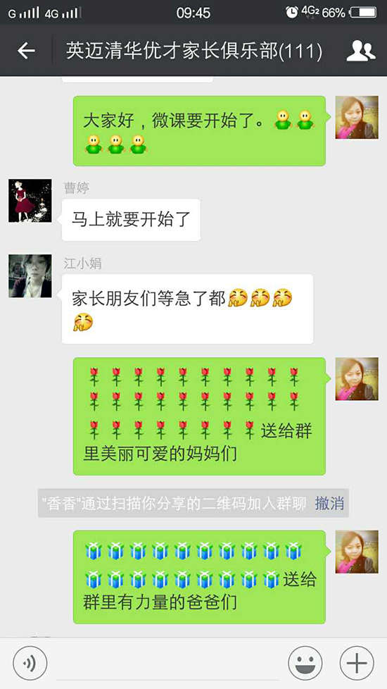 為了豐富教學(xué)內(nèi)容,創(chuàng)新教學(xué)模式,加大家長的參與度,南昌英邁優(yōu)才培訓(xùn)學(xué)校采用網(wǎng)上微課堂的形式開展家庭教育活動,該活動利用微信平臺,建立家長微信群,通過發(fā)送語音消息的形式,跟家長溝通家庭教育方面的問題,眾多家長紛紛參與,并給出高度評價。此次“空中微課堂”活動是南昌英邁優(yōu)才培訓(xùn)學(xué)校楊校長結(jié)合她平時的教學(xué)經(jīng)驗(yàn)進(jìn)行的一次創(chuàng)新。