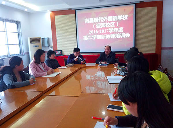 新教師培訓是規范學校管理、提高教育教學質量,使新教師盡快提高教學水平的一項重要工作。2月17日下午,2017年新教師入職培訓會在南昌現代外國語學校(迎賓校區)行政樓二樓會議室舉行。學校楊校長、初中部鄧校長、小學部傅校長、校辦公室周老師以及新招聘的9名新教師參加了培訓會。
