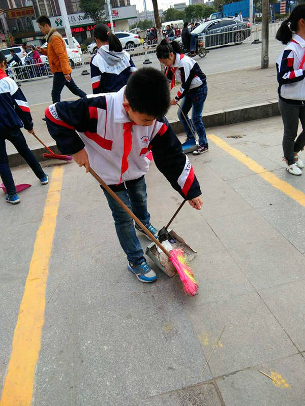 3月6日下午班會課時,在年級組組長熊梅老師的帶領下,組織了部分少先隊員開展了愛護環境義務勞動。對學校周邊的衛生進行全面的打掃,同學們沒有畏懼這些臟亂的角落,個個發揮不怕苦、不怕累的精神,分工協作,經過近一小時的勞動,校園周邊環境煥然一新。雖然同學們都累得汗流浹背,但看到自己的辛勤勞動換來了干凈整潔的環境,大家都會心的相視而笑。