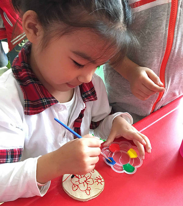 今天張老師給我們帶來了一節美術課《小木樁大創意》課程,開始前,張老師帶小朋友進行了一個小游戲木頭人,一下就調動了小朋友們的上課積極性。之后在張老師的精心準備下,一幅幅漂亮的圖片展現在大家面前,完全吸引了小朋友的眼球。這時,張老師引入了今天的主題木樁畫,小朋友平時作畫都是在我們的素描紙上,這次用了不同的材料——水粉,小朋友都很感興趣。
