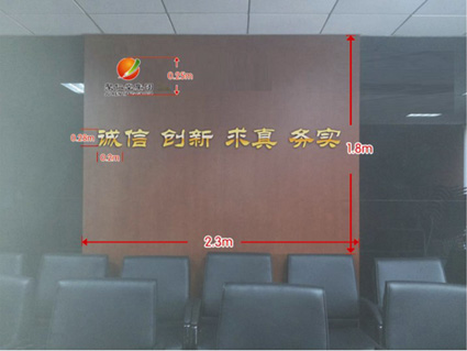除前臺外,集團辦公區域設計主要集中在照片墻、辦公室門牌和會議室背景墻上。照片墻上的相框錯落有序排列著,里面展示的是各位領導蒞臨集團及集團各下屬企業、院校視察的照片,充分展現了集團輝煌的發展歷程。各部門辦公室的門牌外形設計為長方形,配以藍色底紋,與藍色的防撞貼顏色相呼應,讓人形成統一的視覺感受。順著過道一直往里走,來到了寬敞的會議室。根據會議室背景墻設計方案,將在幕墻上裝飾 “誠信 創新 求真 務實”8個水晶大字,提醒大家要時刻謹記集團的經營理念,努力實現集團的發展目標。