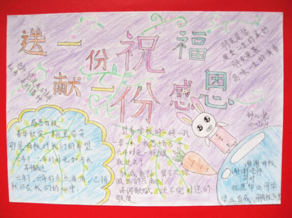 通過活動的開展,孩子們在回憶和留戀中又一次體會到了老師的關懷和同學的友誼,緩解了畢業班學生緊張的學習生活,使校園內外掀起了一股感恩老師的濃厚氛圍,也增加了同學之間的深厚友誼,希望他們都能帶著感恩的心出發,向著夢想前進,走的更遠、飛得更高。