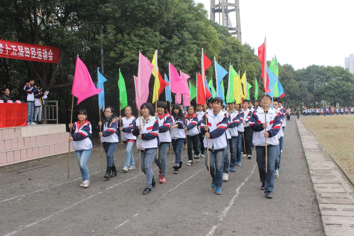 紅旗璀璨、彩旗奪目、樂聲雄壯!伴隨著《運動員進行曲》的激昂旋律,各年級各班的運動員們排著整齊的方陣,在國旗隊、校徽隊、校旗隊、彩旗隊、氣球隊的引領下,昂首步入會場。嘹亮的口號彰顯出同學們的青春風采和高昂斗志。英姿颯爽的旗手,手中高舉的紅旗是我們永遠的驕傲;迎風飄揚的彩旗、整齊劃一的方陣,昭示著現外學子拼搏向上的精神追求;富有氣勢的腳步、鏗鏘有力的口號聲,展示了我們健康奮發的青春活力。
